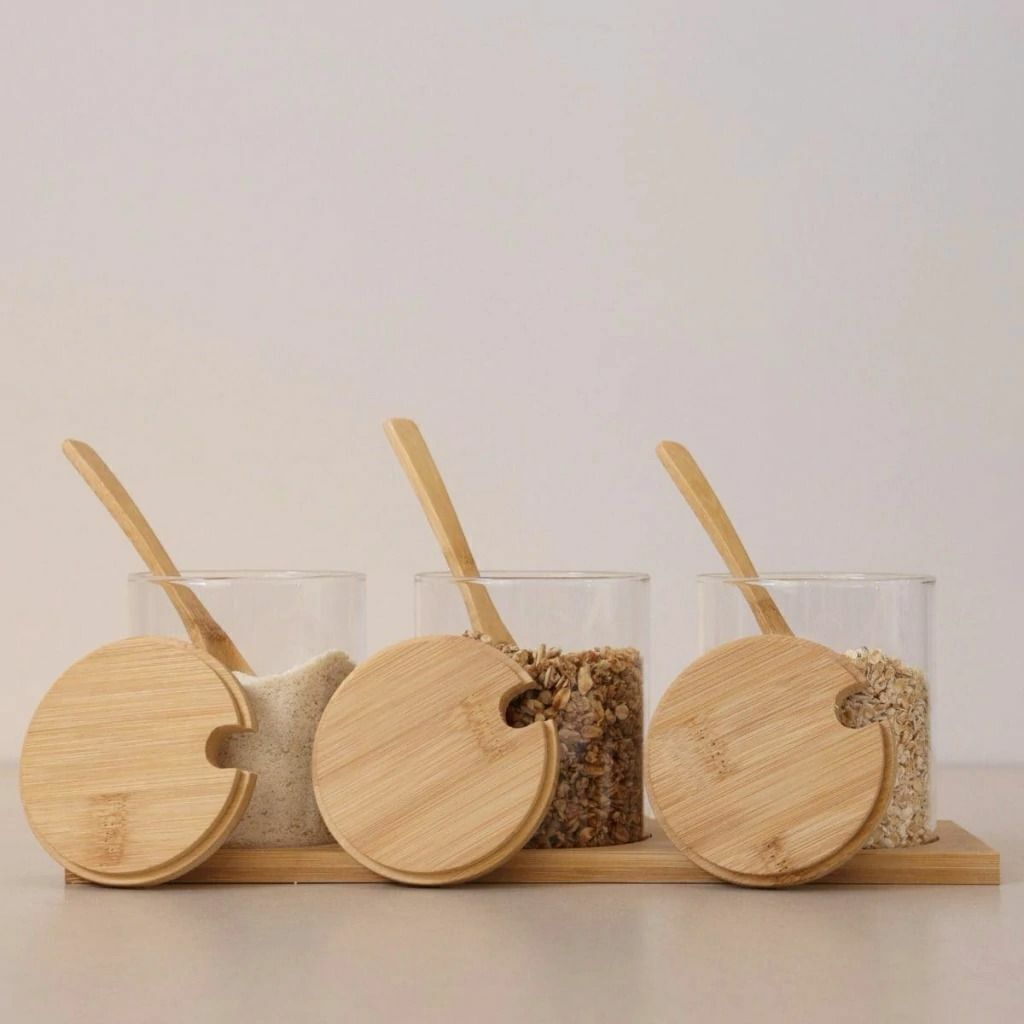 Kit 3 Potes Porta Condimentos com Bandeja de Bambu